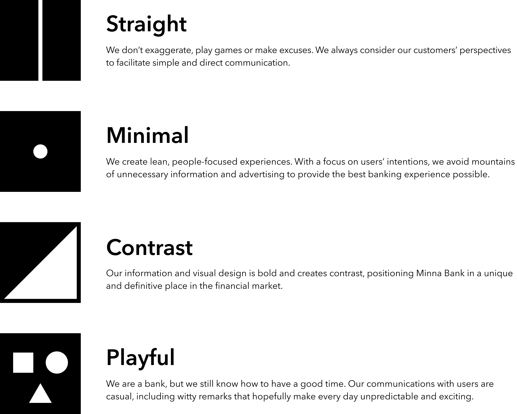 Created 4 design principles: Straight (trust), Minimal (clarity), Contrast (impact), Playful (warmth).